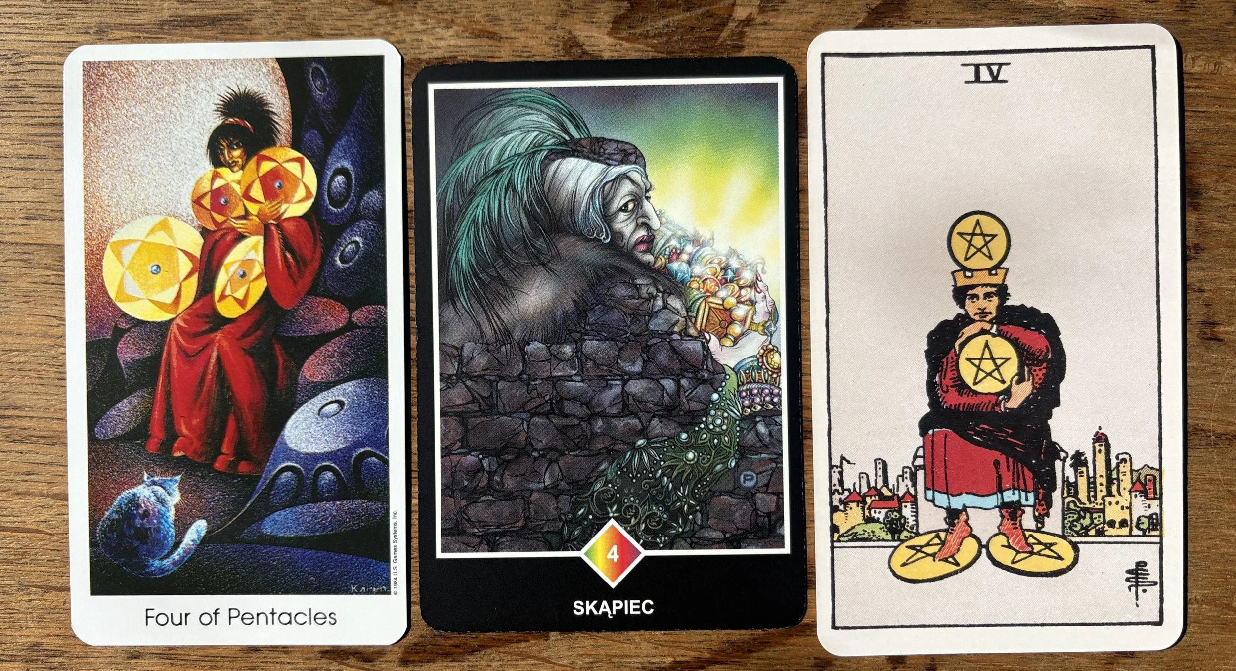 Above from left to right: Four of Pentacles/Coins/Rainbows cards from Tarot of the Cat People, Osho Zen and Waite-Smith Tarot.
