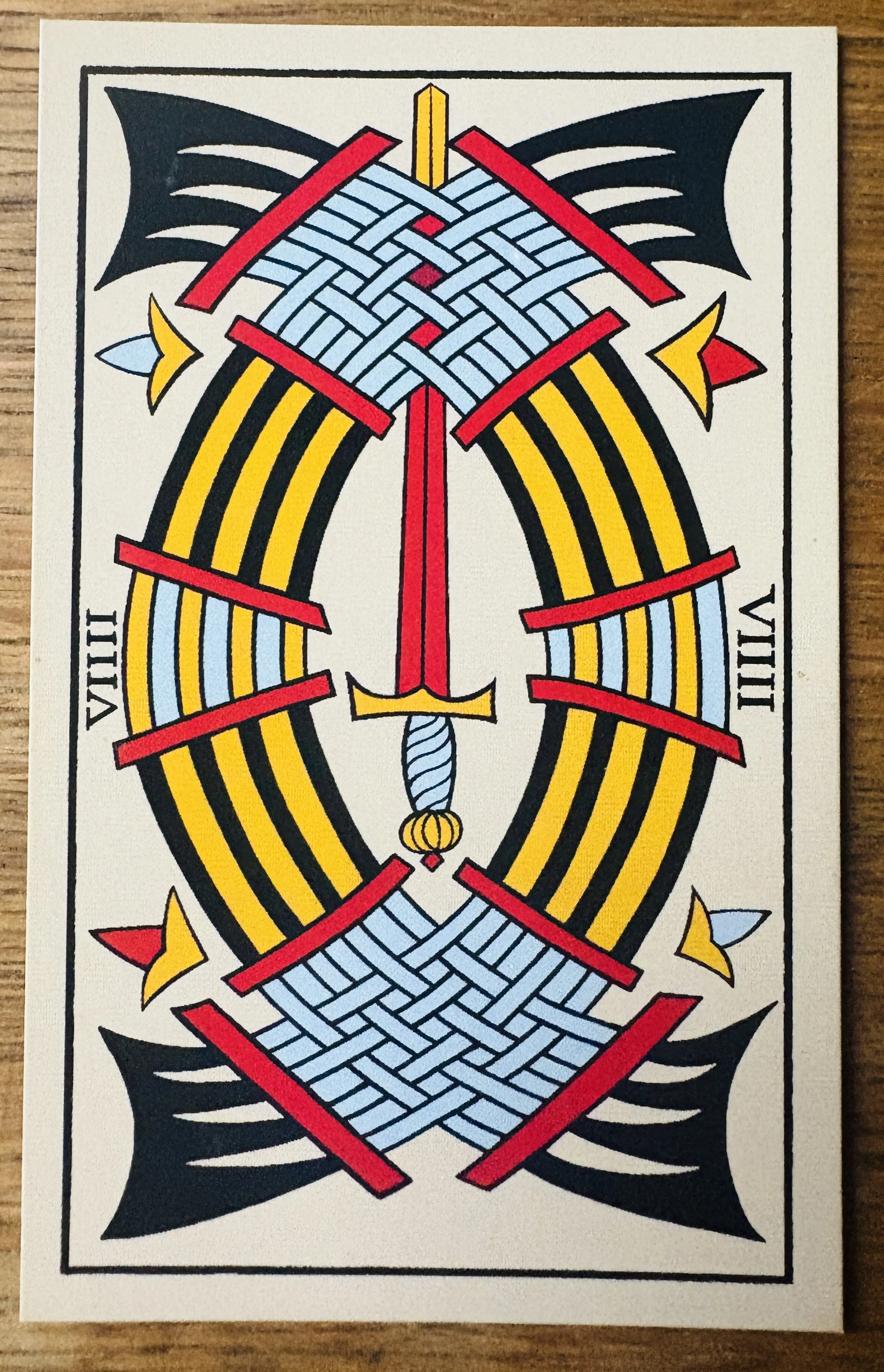 In the centre of the oval shape stands the ninth sword. In the Jodorowsky/Camoin version of the Marseille, it is yellow, the colour of intelligence; it appears to have been broken and put back together. The tip of the sword pushes through the confines of the curved swords to reach for freedom, open space. In the Jean Noblet version, the sword is an intense red colour in the centre of the confined space – an anger, an urgency or passion to escape, perhaps. The sword’s tip turns into clever yellow where its tip escapes the curved swords, making its message known. It’s better where there’s more space. That’s the clever place to be.