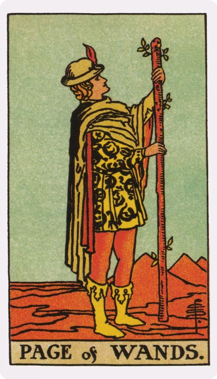 The Page of Wands brings fresh energy into our lives. They may represent a spark of learning, of newness in the realm of Fire, of passion, of creativity. The young Page in both the Tarot de Marseille and the Waite-Smith decks holds a large baton before them, seemingly fascinated by its existence. They face the right (the future direction in Tarot spreads) as if wondering what to do with it, yet excited by a thousand possibilities. In a symbolic sense, someone is ready to spark a new passion or interest, perhaps taking their first baby steps with it. On a more literal, Nature-based level, a potential for the Sun’s energy is held before the eyes.