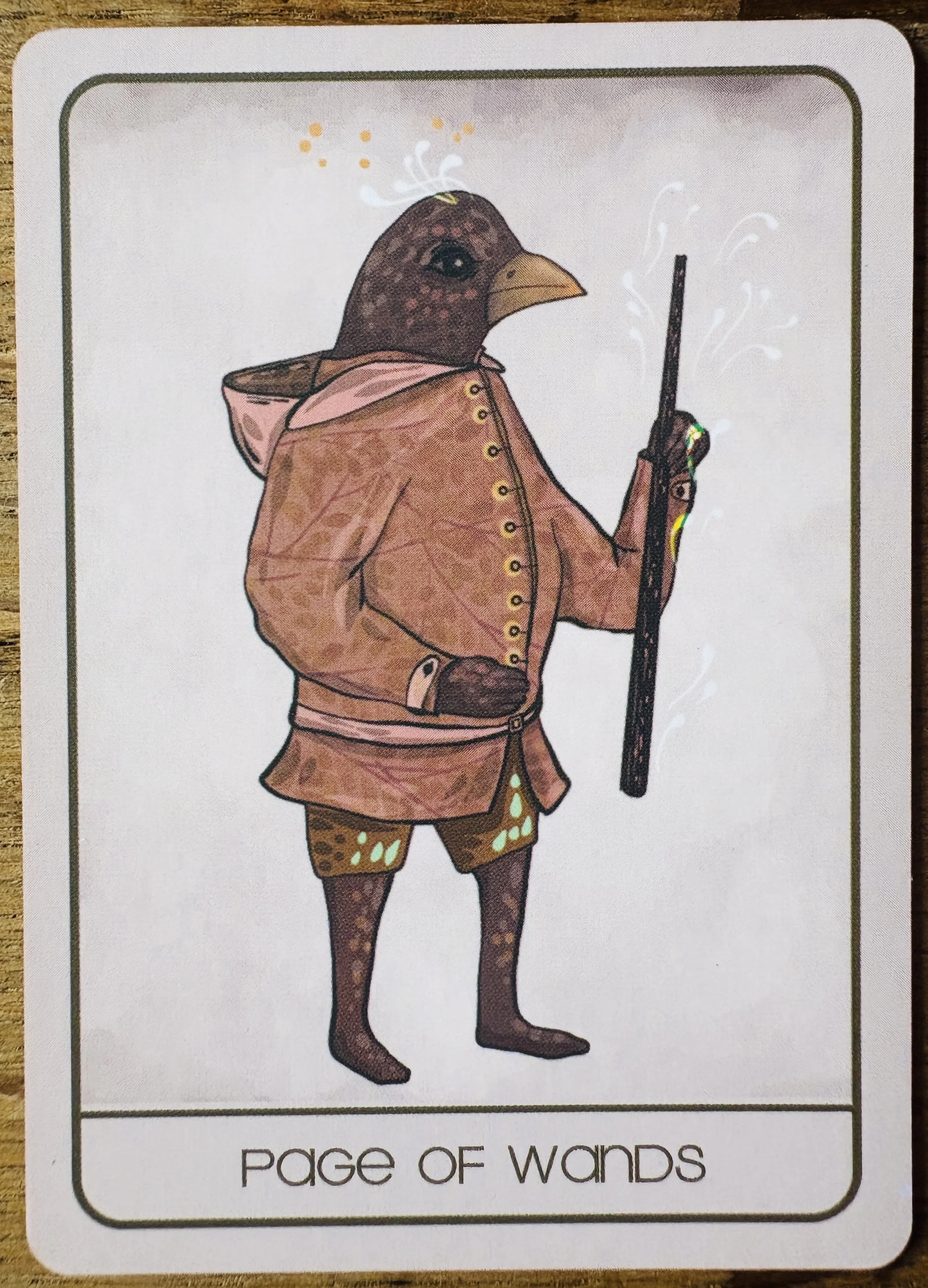 I hold up the herbs before me like the Page of Wands with their stick. I marvel at the amazing power of Fire and smoke. I accept being a learner of each new deck with the smoky energy of the suit of Wands – Fire – and the curiosity of the Page.
