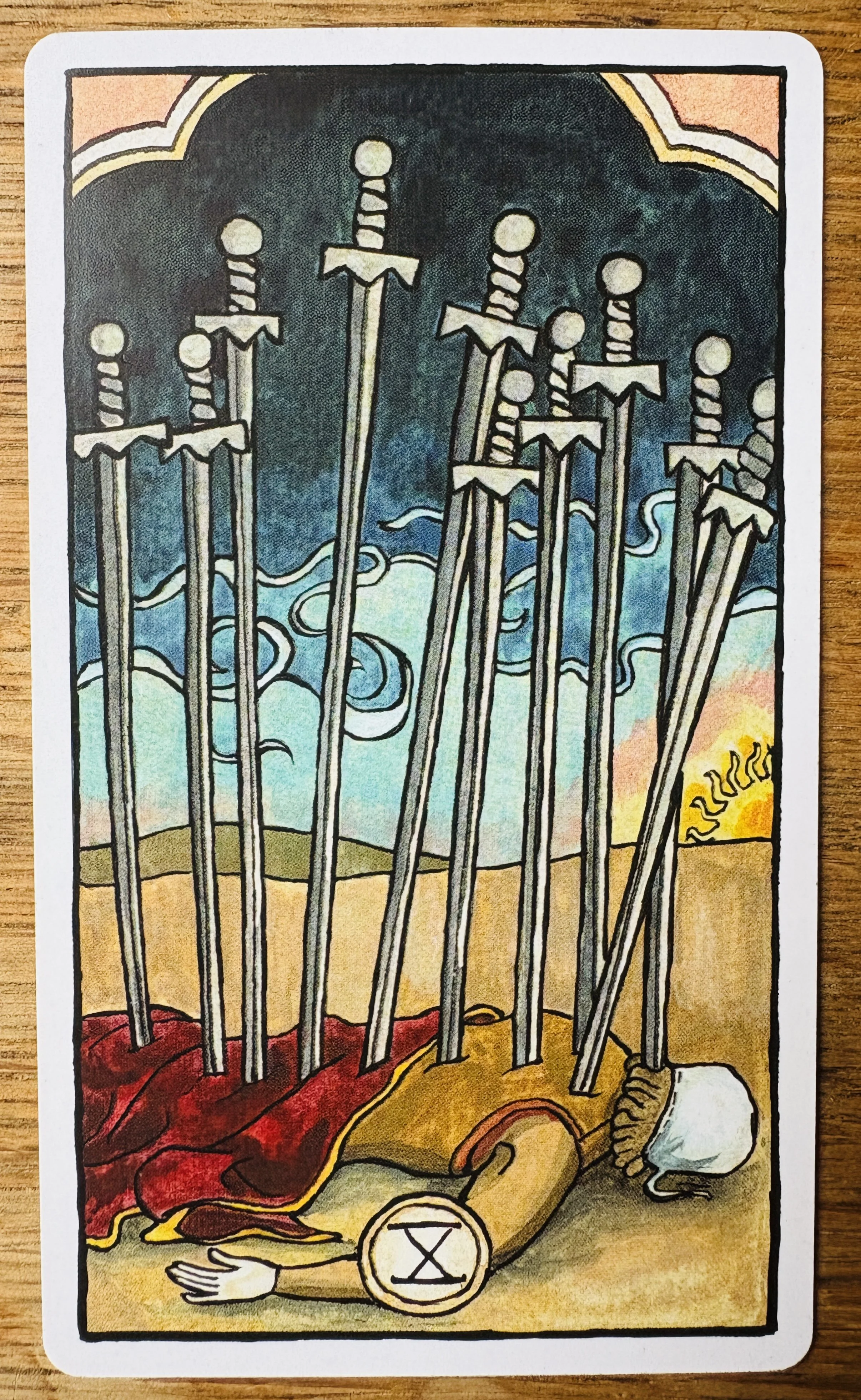 In the Waite-Smith Ten of Swords and decks inspired by it, a figure lies on the ground with Ten Swords sticking out of their body, although, curiously, there is little or no blood. The skies are either turning black over a yellow horizon – the darkness coming – or the skies are clearing to reveal Earth’s continuing beauty.